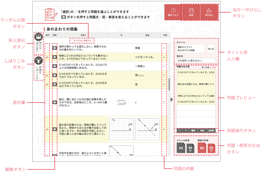 選ばれた問題は,画面右の問題プレビューに表示されます。 問題操作ボタンを押せば,問題順の並びかえや削除などを行うことができます。 |