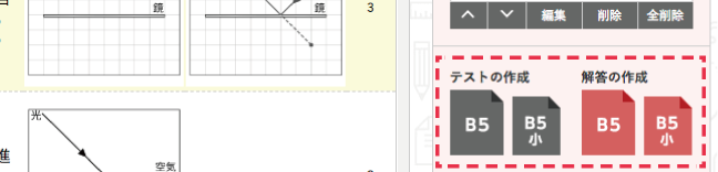 全ての入力が終わったら問題・解答の完成ボタンを選んでください。 「B 5」はB 5判ぴったりのサイズ,「B 5小」はノートにはれるようにB5を少し縮小したサイズでテストが作れます。 |
