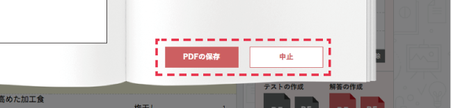画面上で小テストの完成イメージを確認してください。 「PDF の保存」を選ぶと,テストをPDF形式のデータで保存することができます。 「中止」を選ぶと,問題選択画面に戻ります。 |